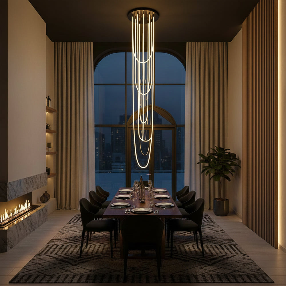 Oui, grâce à sa liberté de forme et à sa suspension variable, il est idéal pour les pièces à hauts plafonds - par exemple les cages d'escalier, les galeries ou les espaces de vie ouverts.
