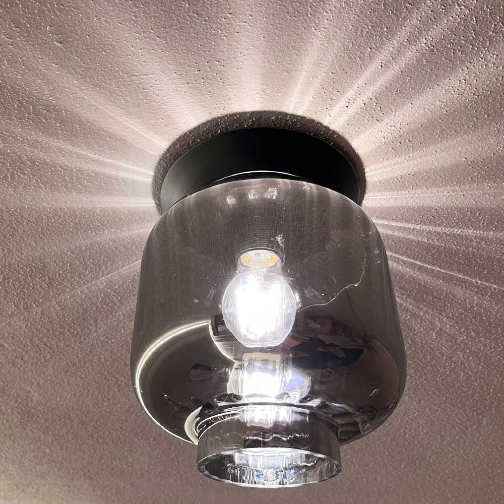 Le plafonnier est disponible en fumé, transparent et brun et se décline en trois tailles de 18, 20 et 25 cm de diamètre.